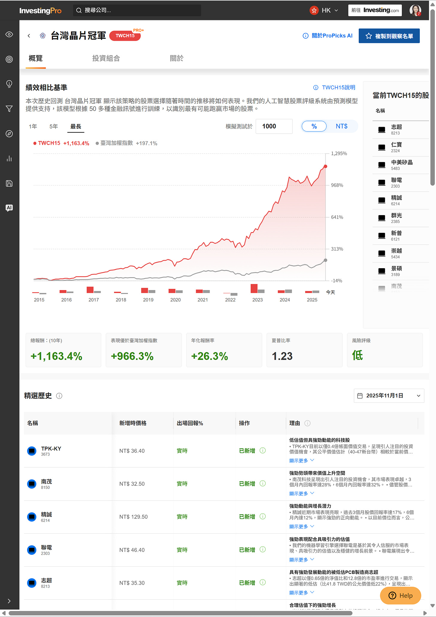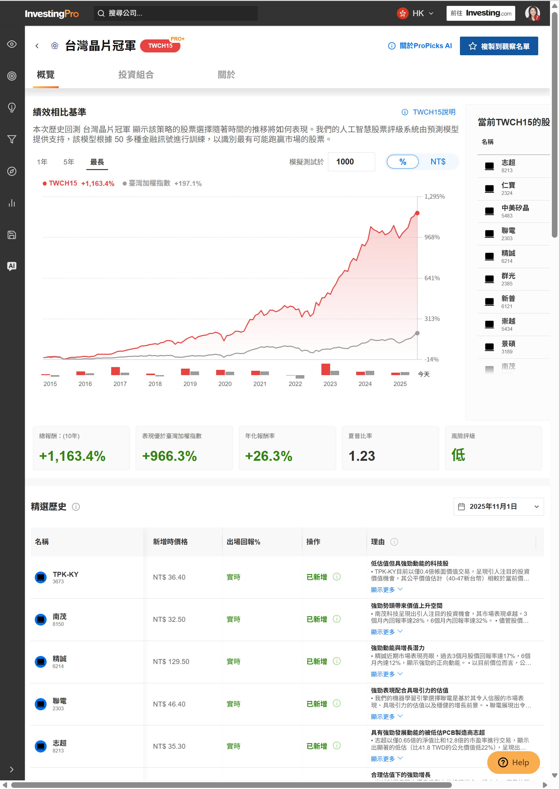 除了美股的 IT15 策略外,ProPicks 也針對亞洲市場推出「台灣晶片冠軍 (TWCH15)」,聚焦於半導體與電子供應鏈的關鍵企業。這一策略結合本地財報資料與 AI 篩選模型,鎖定兼具 研發強度、現金流穩健與估值合理性 的台灣晶片領導公司。