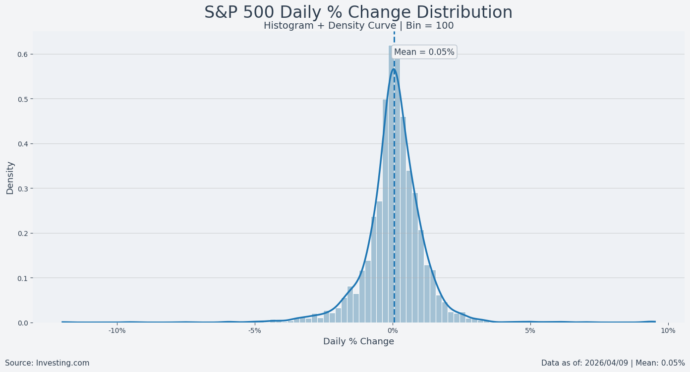 從 S&P 500 的每日報酬分布來看,多數交易日的漲跌幅其實非常有限:
