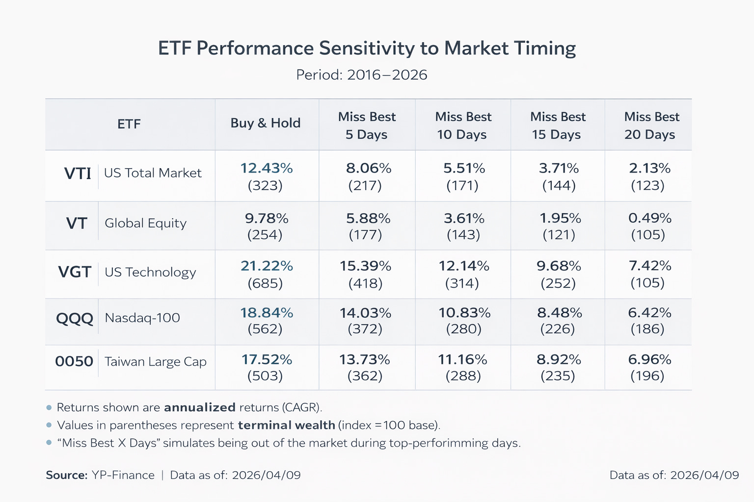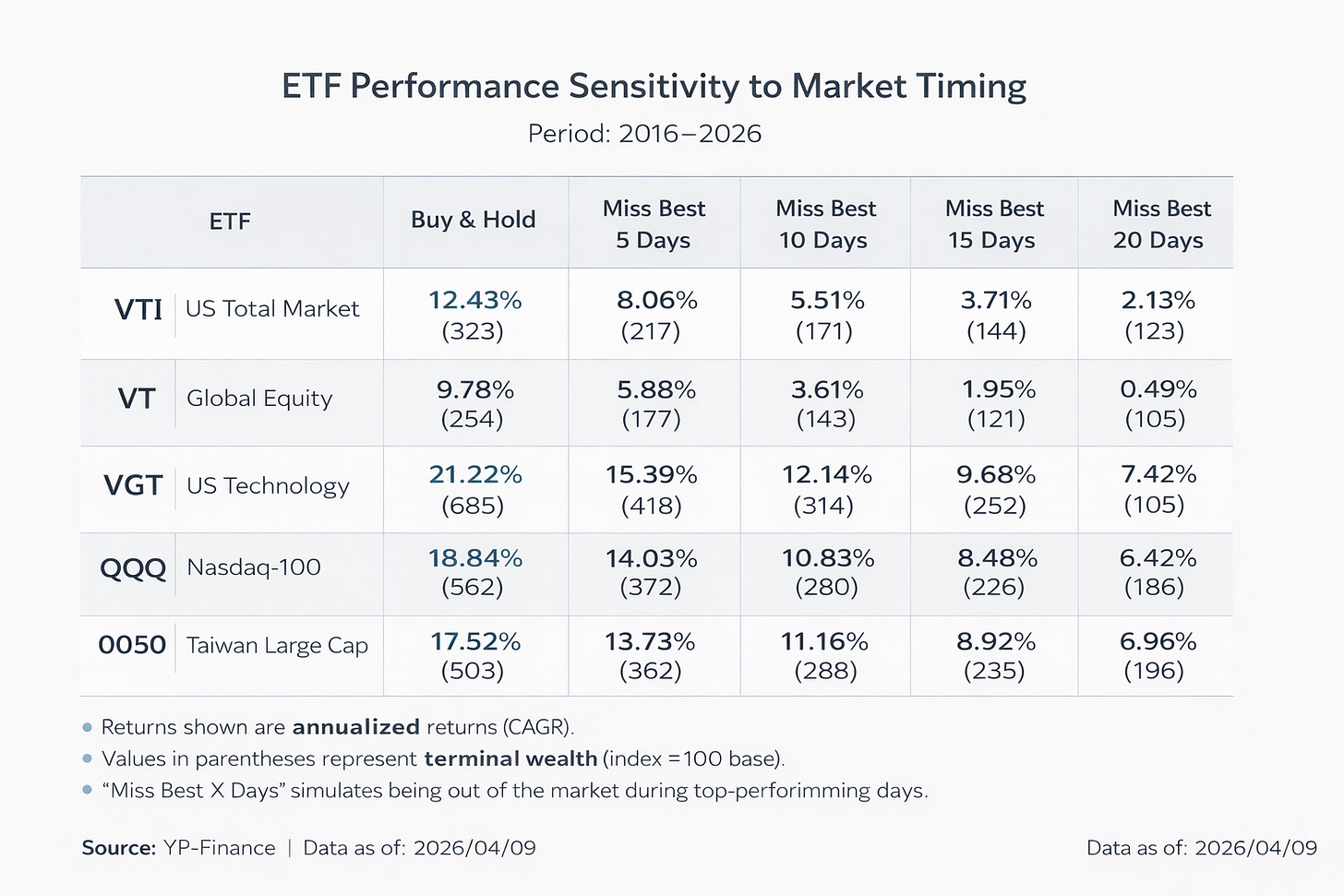 從 2016 到 2026 年,多個代表性 ETF(VTI、VT、QQQ、VGT、0050)的長期表現顯示:只要錯過市場中極少數幾天,投資結果就會出現結構性的崩塌。